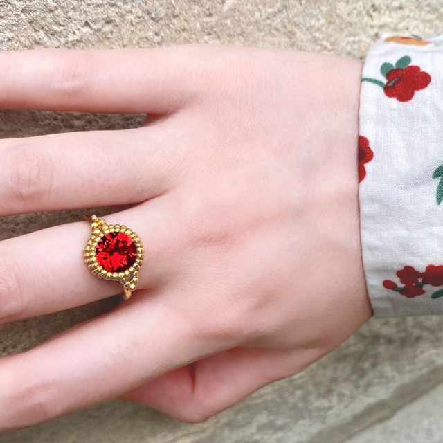 Un bijou qui capte la lumière… et les regards. La bague Sixtine marie l’intensité d’un cristal à l’éclat d’un tissage de rocailles doré texturé, comme un trésor venu d’un autre temps. Fine mais affirmée, elle sublime chaque geste d’un éclat hypnotique.