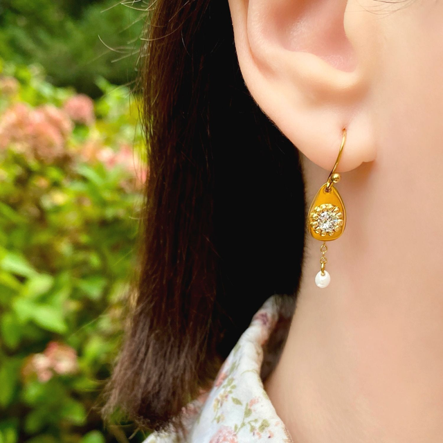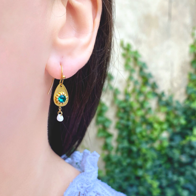 Crochets d'oreilles en acier doré arborent un design en forme de goutte, sublimées par un tissage délicat de perles de rocailles japonaises avec son cristal et d’une perle suspendue, pour un style résolument féminin et intemporel.
